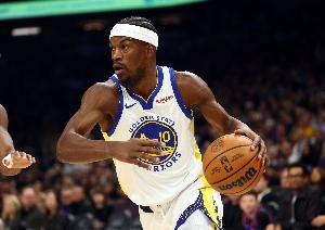 比赛第三节,勇士球星吉米·巴特勒右膝受伤,被队友架着回到更衣室,随后退出了本场比赛。