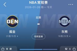 体育资讯01月26日讯 ESPN名记Shams报道,原定于今日凌晨04:30分进行的NBA常规赛,灰熊主场对阵掘金的比赛,因天气原因延期进行。